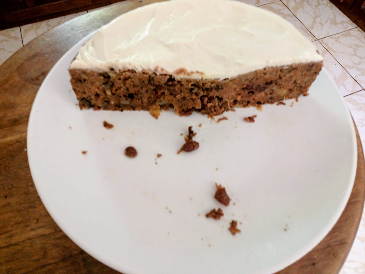 Cream cheese icing, raisins, crushed pineapple, 6 cups of shredded carrots, and walnuts. All took an hour to bake (that was a definite downside in the heat!